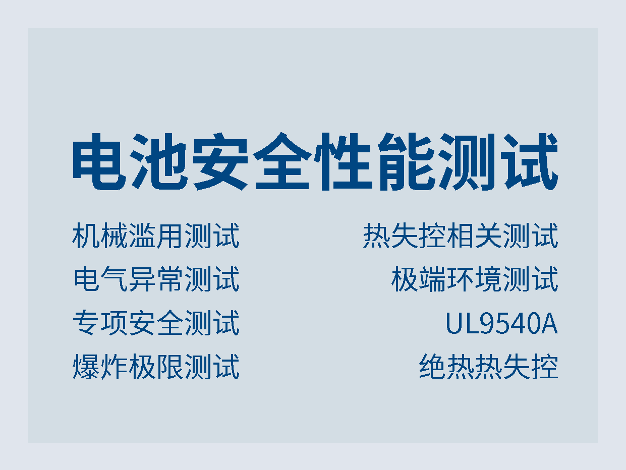涵盖热失控、机械滥用、电气异常、极端环境等四大类核心测试,全面模拟电池在各类风险场景下的安全表现: